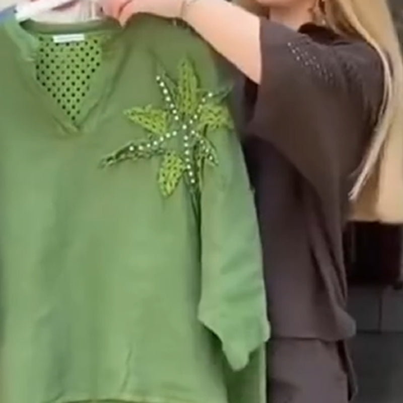 2-PIECE COORDINATED SET WITH ELEVATION: Refresh your everyday wardrobe with this thoughtfully designed two-piece set. The top features a breathable, openwork design for added comfort, while subtle 3D details on both the top and pants add a sophisticated touch.