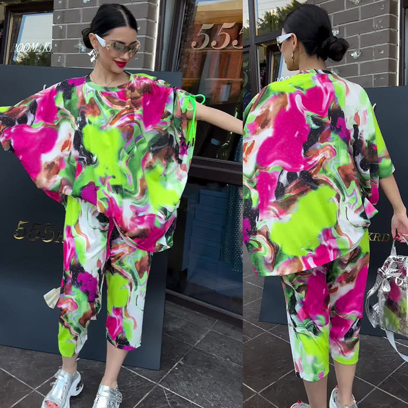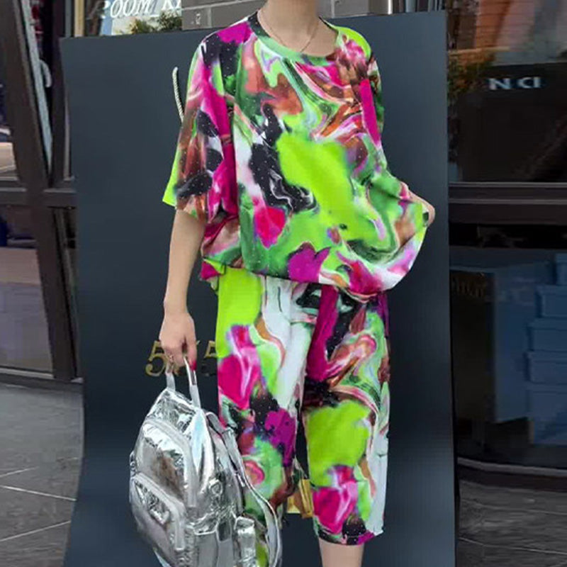 Tie-Dye Print Loose Short-Sleeve and Capri Pants Set
