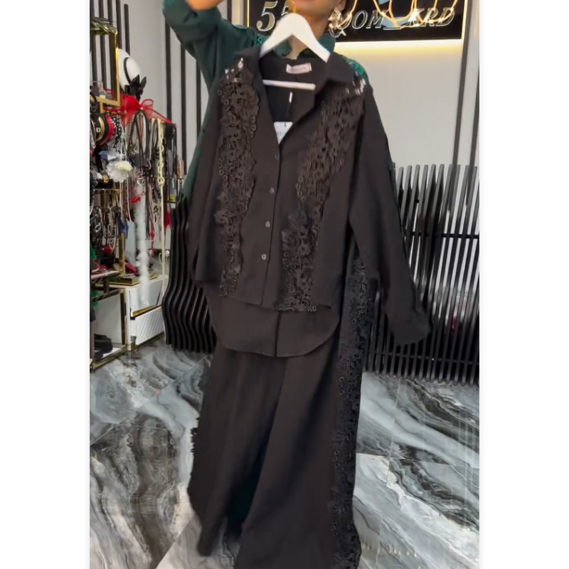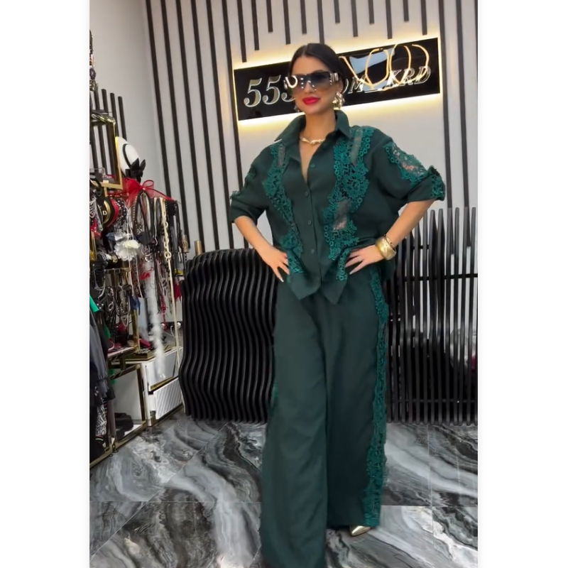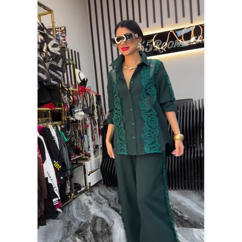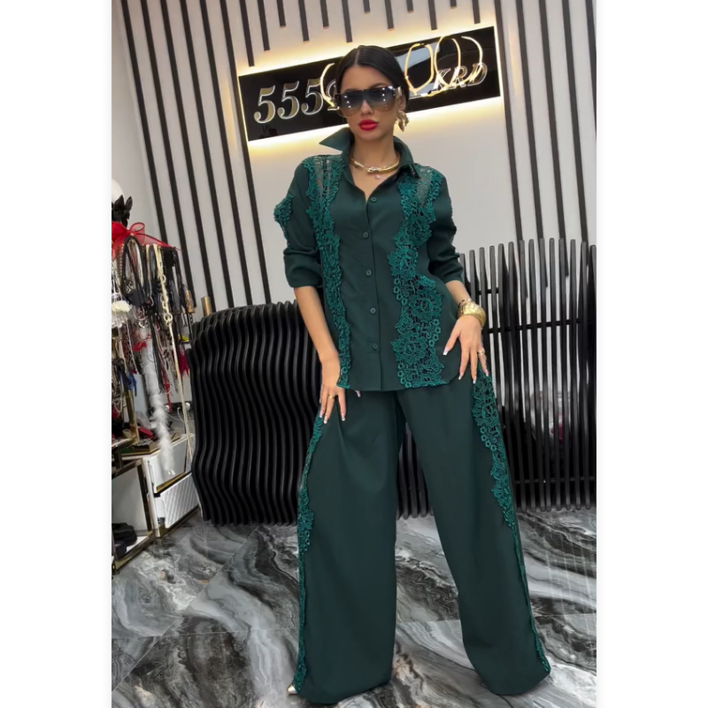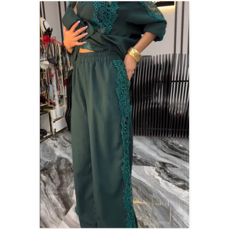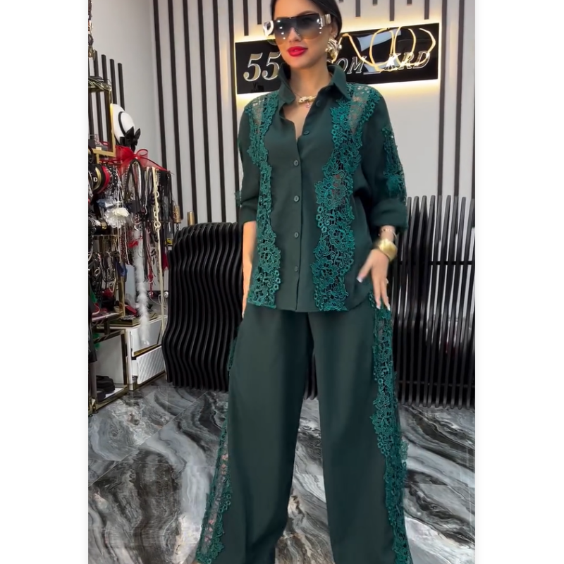Chic Lace Patchwork Shirt & Wide-Leg Pants 2-PCS Set