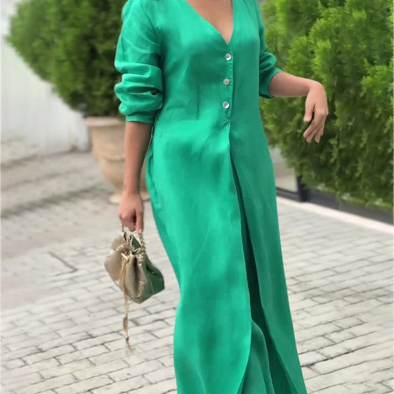 Women's Solid Color V-Neck Button-Up Jumpsuit