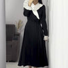 UNIQUE BLACK AND WHITE NECKLINE: Showcases a unique neckline with an intersection of black and white colors. This striking contrast adds a modern twist to the classic dress design, drawing attention and offering a sophisticated touch. The bold neckline enhances the dress’s visual appeal.