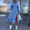 Women’s Blue Printed V-neck Long-sleeve Dress