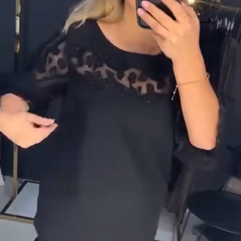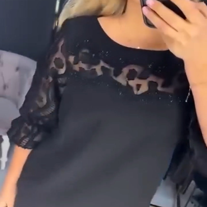 Women’s Elegant Black Midi Dress with Sheer Lace Panel