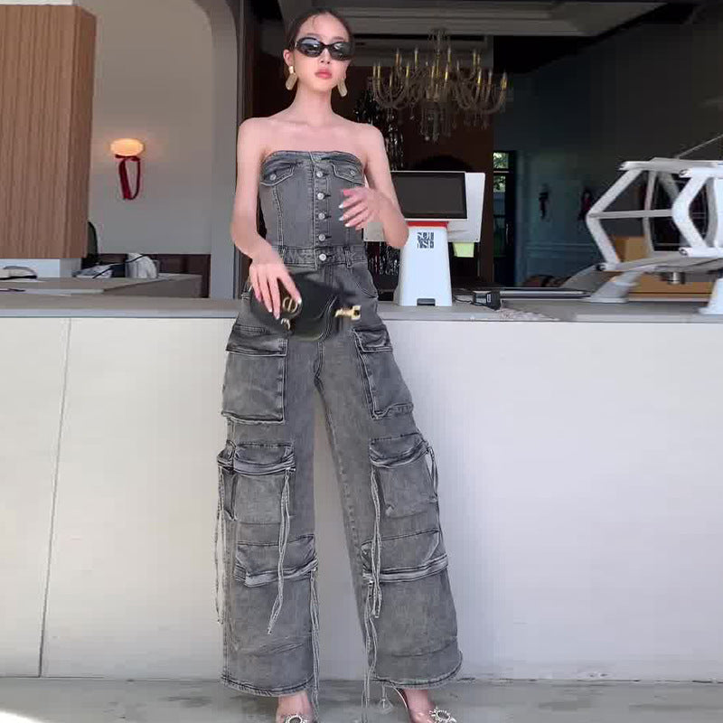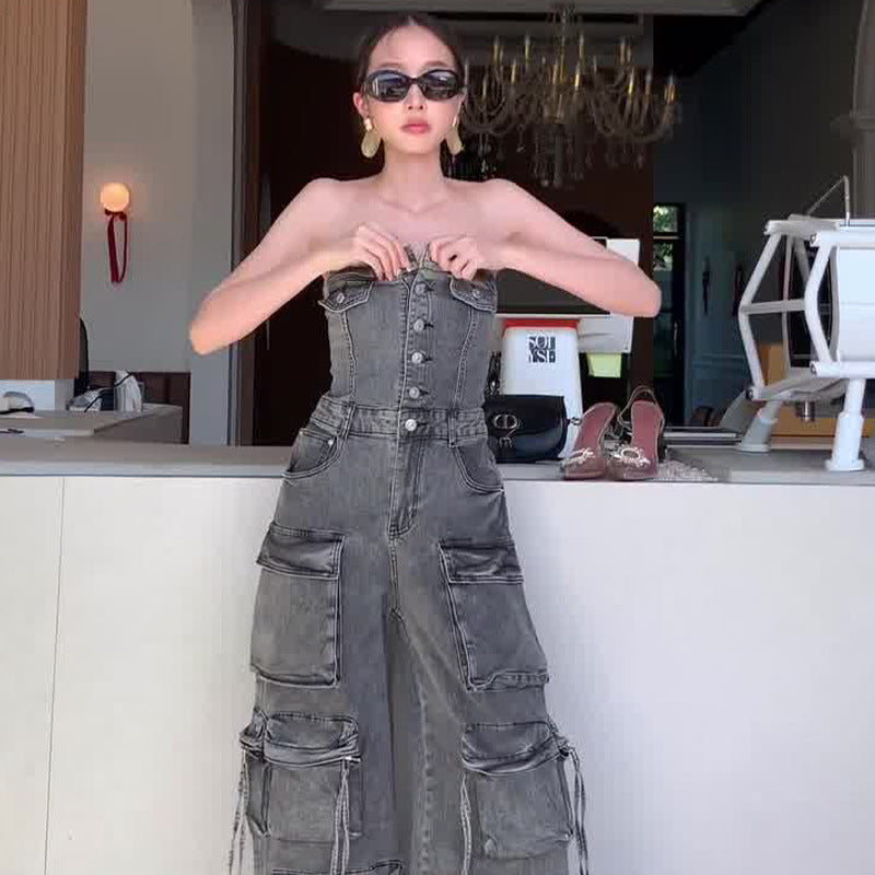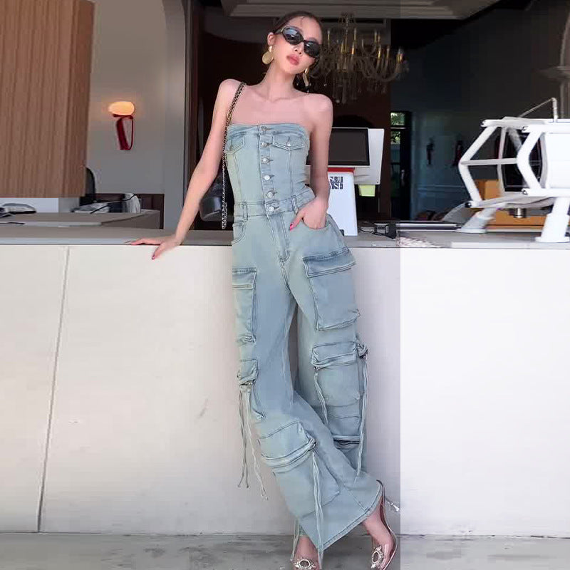 Package Includes:1*Women's Retro Denim Strapless Cargo Jumpsuit